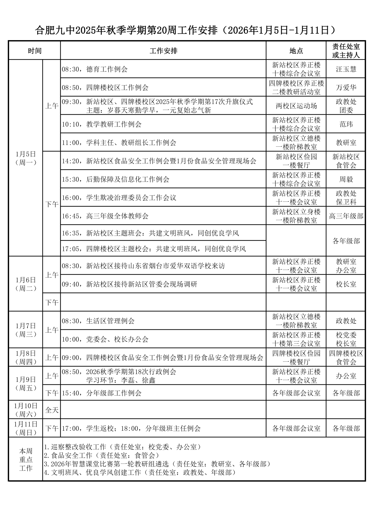 合肥九中2025年秋季学期第20周工作安排(1月5日——1月11日)