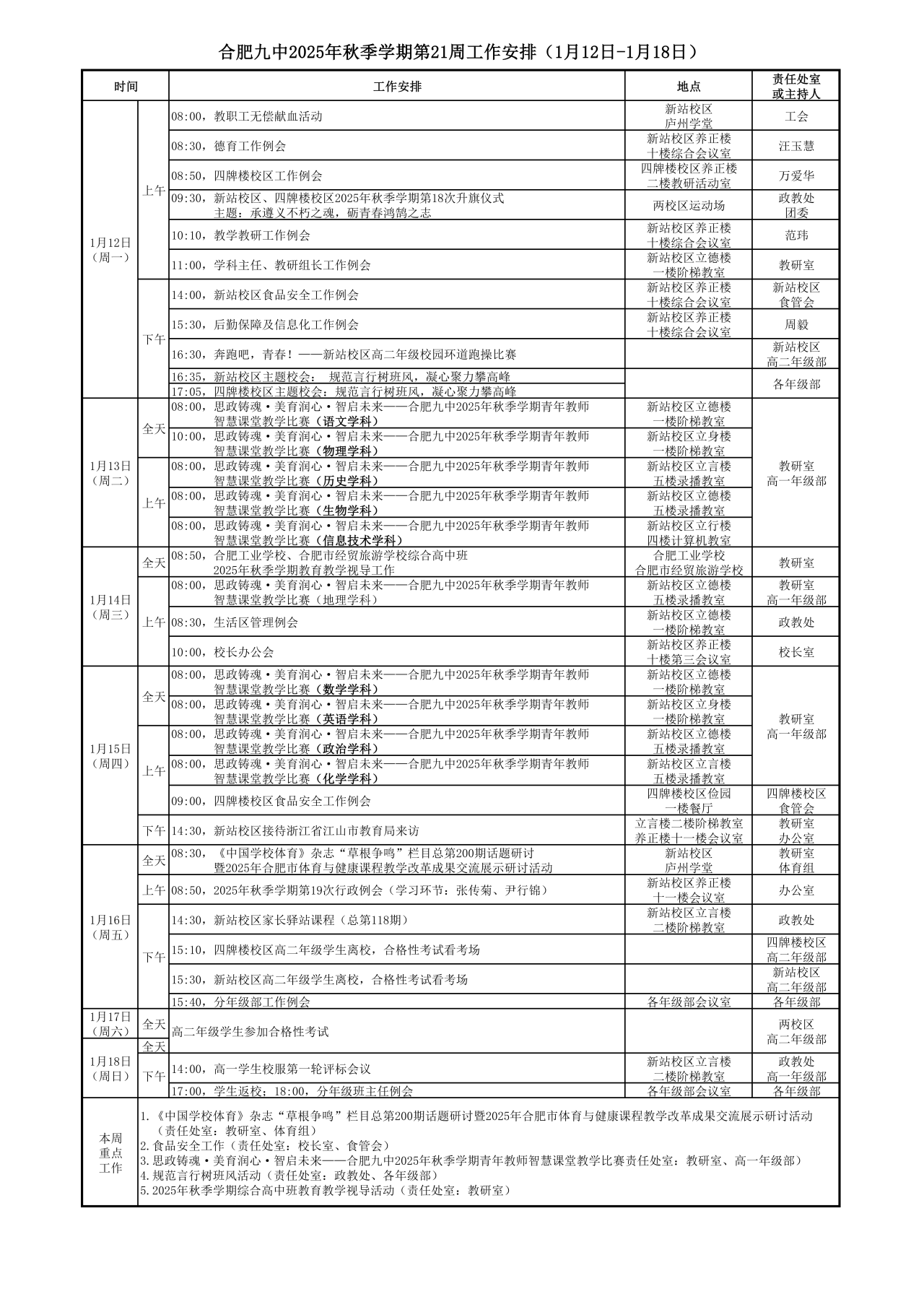 合肥九中2025年秋季学期第21周工作安排(1月12日——1月18日)