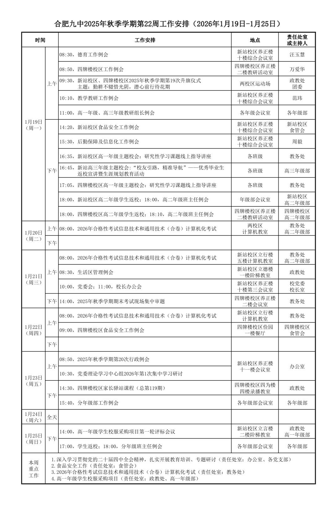 合肥九中2025年秋季学期第22周工作安排(1月19日——1月25日)