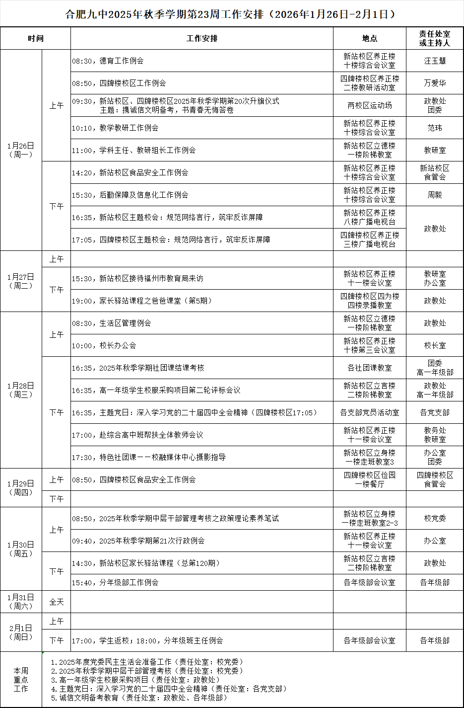 合肥九中2025年秋季学期第23周工作安排(1月26日——2月1日)