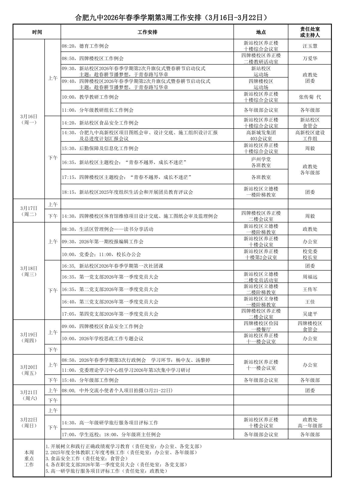 合肥九中2026年春季学期第3周工作安排(2026年3月16日——3月20日)