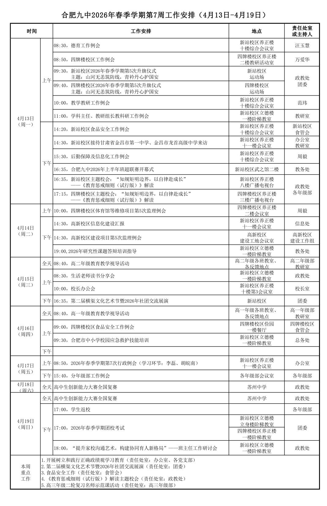 合肥九中2026年春季学期第7周工作安排(2026年4月13日——4月19日)